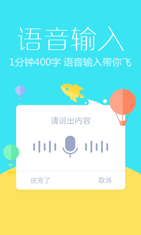 讯飞输入法智能语音输入,识别准确率98%;语音智适应,知你所想懂你所说;语音口令,一次准确识别;支持离线语音,没有流量也能语音输入。1分钟400字,语音输入带你飞!