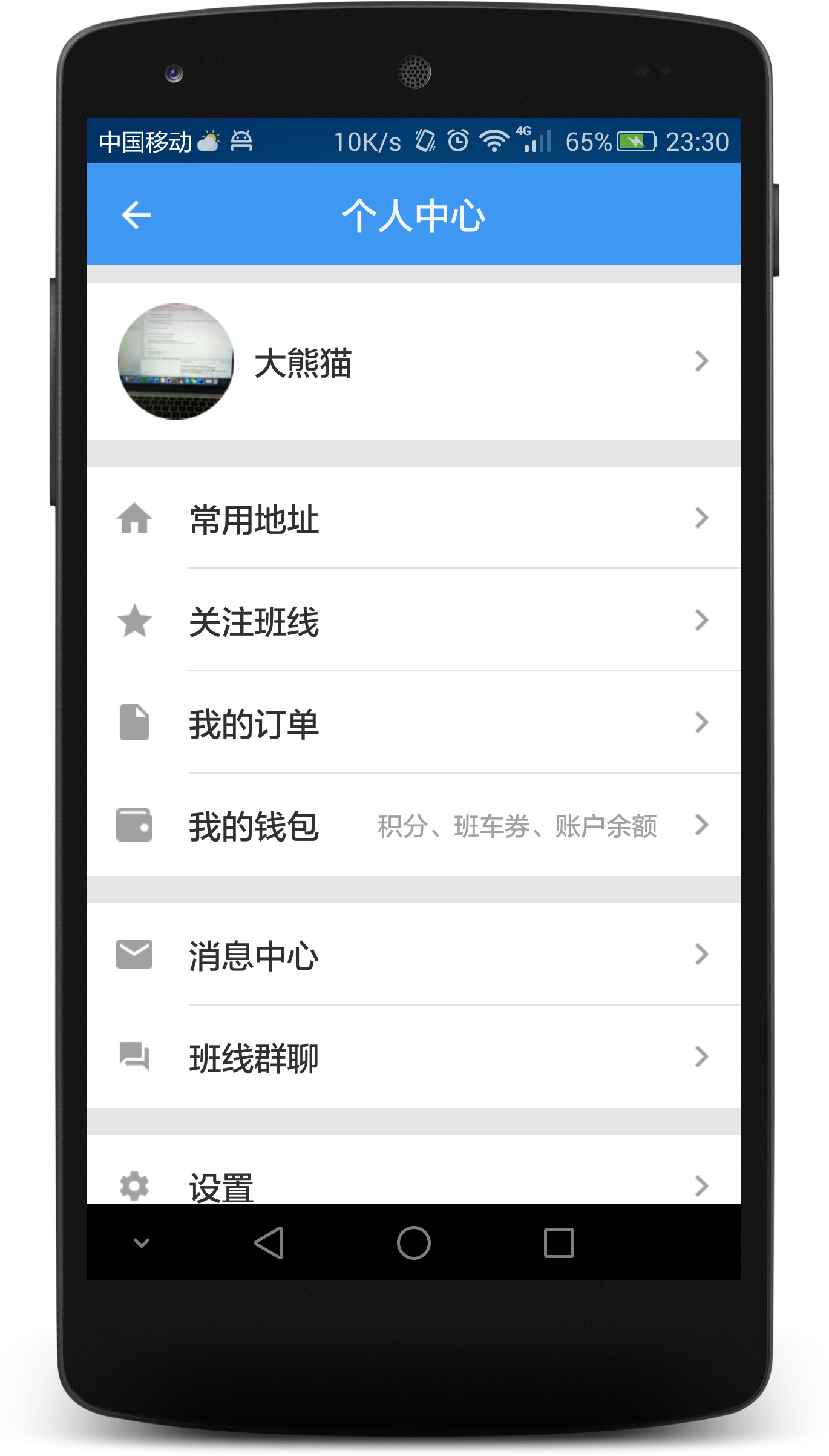 1、个人中心:简单注册后可轻松管理班线、订单、积分、班车券等信息。