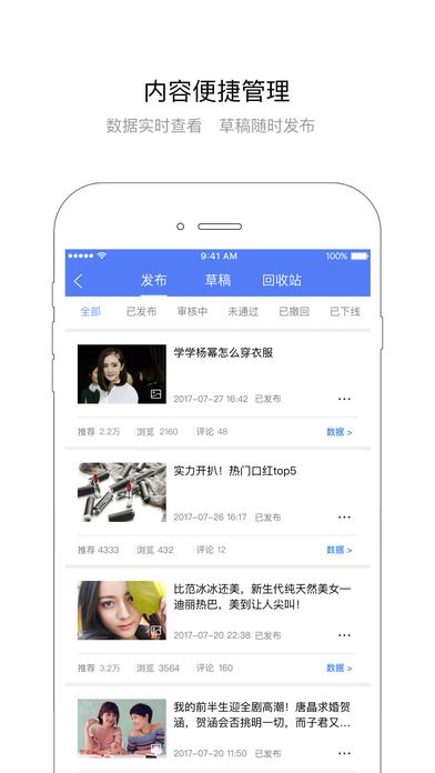 2、百家号App让创作者能在手机上便捷的管理和发布文章、图集、视频等内容,查看内容和收入数据,以及实时接收平台公告和消息。