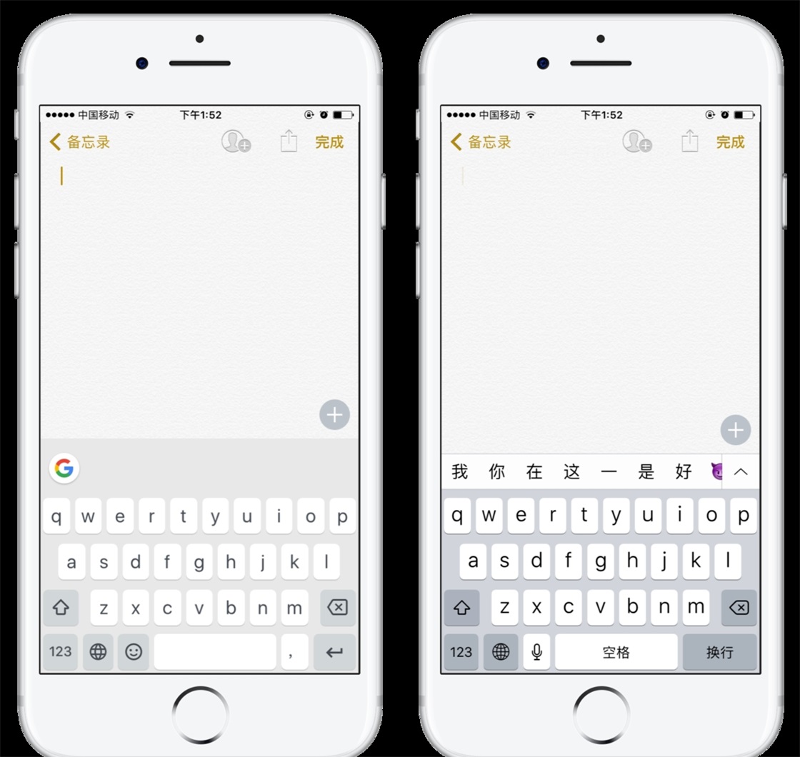 • 滑行光标控制功能:用手指在空格键上滑动即可移动光标