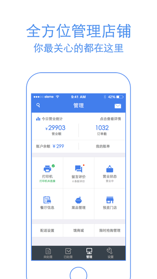 饿了么商家版5.2.4版下载:是一款美食外卖手机客户端,为外卖美食商家们量身定制。商家们可以随时随地在手机上查看店内的美食订单,最快的接收订单、处理订单,保证在半小时内将美食送到您的手中。饿了么商家版5.2.4版下载功能: 1.快速搜罗附近外卖,不用打电话直接预订;