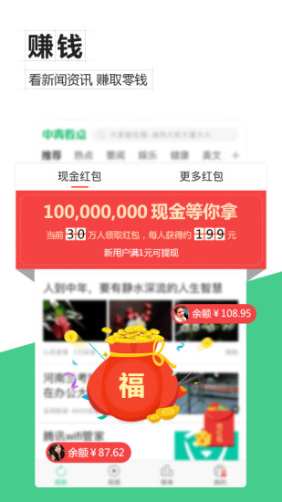 1、中青看点是真的能赚钱,阅读、分享、邀请好友都可以赚钱。