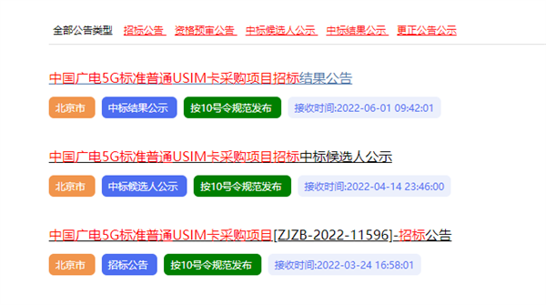 6月1日,中国招标投标公共服务平台发布了《中国广电5G标准普通USIM卡采购项目招标结果公告》。