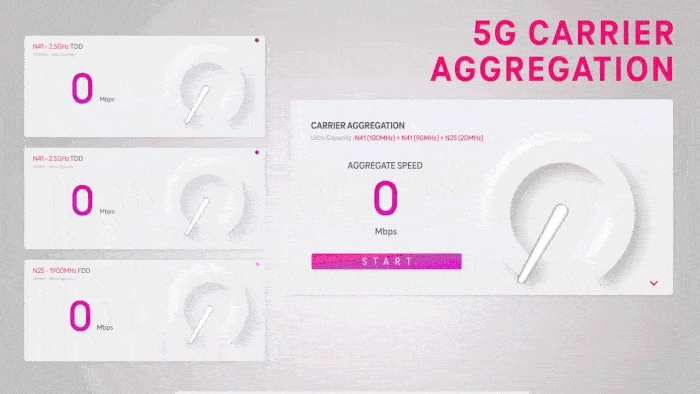 以本次测试为例,Un-carrier 平台聚合了三个 5G 信道 —— 包括两个 2.5 GHz 超容量 + 一个 1900 MHz 的 5G 信道 —— 合并提供了 210 MHz 的频宽。