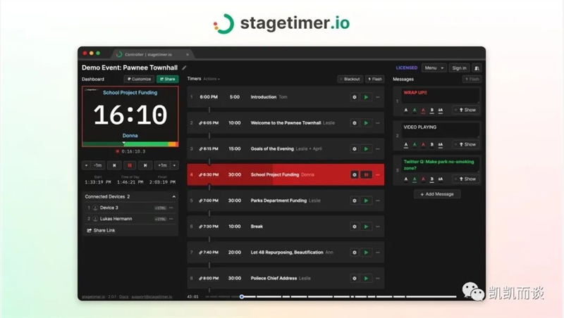 它允许导入或创建到你的事件的议程,并共享一个链接到它。然后你可以控制演示者或参与者看到的内容。显示带有写入消息选项的全屏计时器。