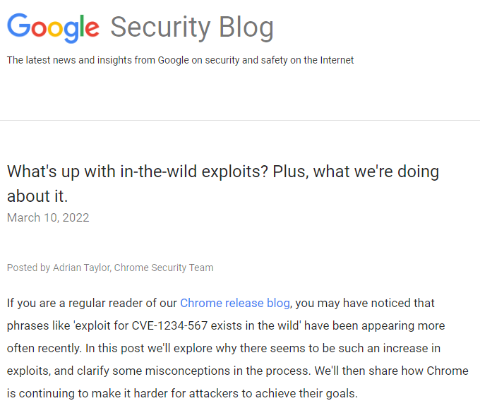 上周,Chrome Security 团队的 Adrian Taylor,在一篇谷歌安全博客文章中解释了“为何在野外被利用的 CVE 漏洞似乎有所增加”。对于这种漏洞利用的可见性增长趋势,归咎于多个方面的因素。而谷歌旗下的 Project Zero 团队,也有对包括 WebKit、IE、Flash、Firefox 和 Chrome 在内的所有已识别的浏览器零日漏洞展开追踪。