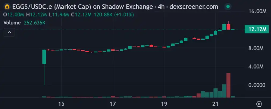 EGGS上线首日市值突破700万美元,目前市值约为1212万美元,一周内上涨58%。