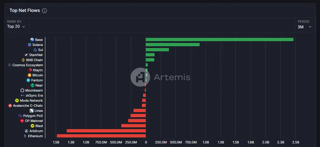 此外,Base在资金流入方面也展现出强劲势头。近三个月,Base净流入资金25亿美元,超过Solana的9亿美元,成为净流入最高的公链。