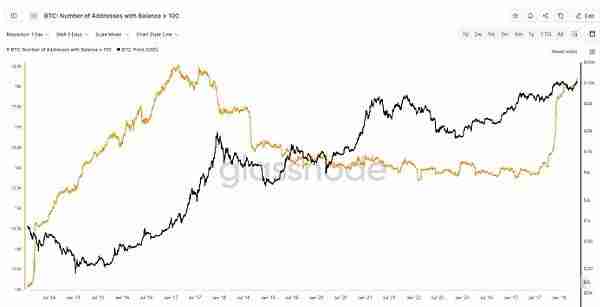 持有超过 100 BTC 的 BTC 地址数量。来源:Glassnode